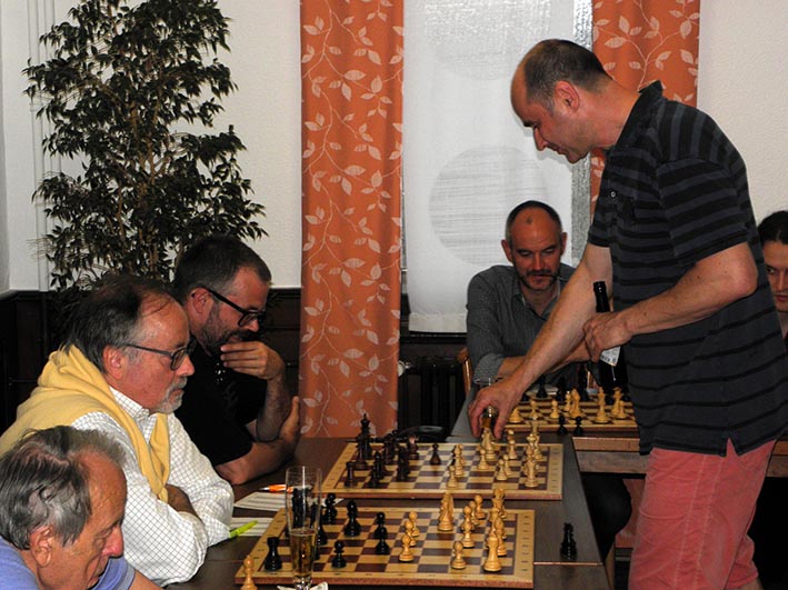 So kam es denn auch. Von den 17 Spielen verlor Herda 8, spielte an sechs Brettern Remis und verbuchte immerhin drei Siege. Kein schlechtes Ergebnis für jemanden, der das Simultanbspielen nicht gewohnt ist, schon im Reisevorbereitungsstress stand und ja auch nicht die schlechtesten Gegner hatte.